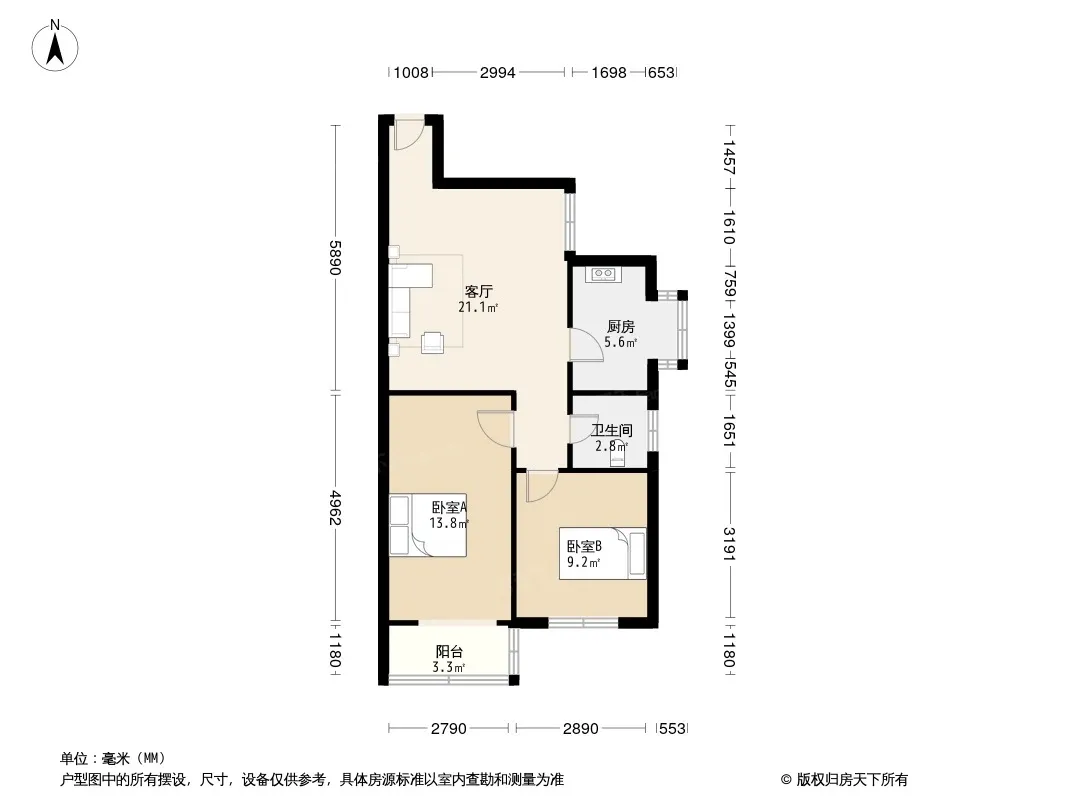 户型齐全,主打明厨,客厅朝南,双阳台二居