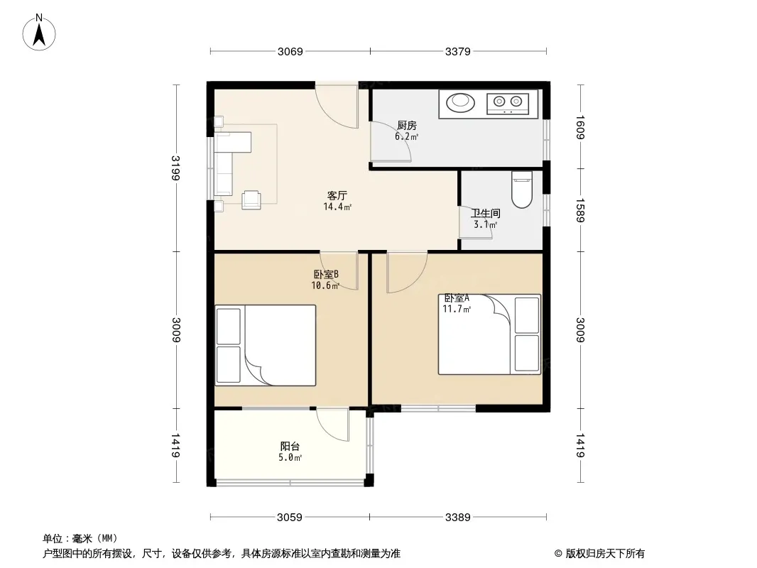 户型齐全,主打明厨,客厅朝南,主卧朝南二居