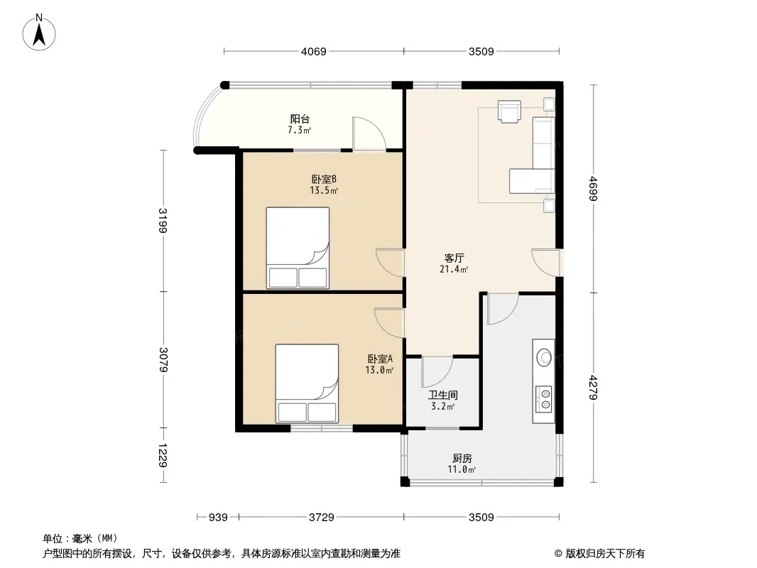 户型齐全,主打明厨,客厅朝南,主卧朝南二居