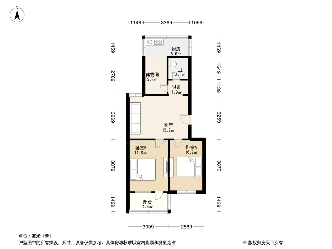 户型齐全,主打明厨,客厅朝南,主卧朝南二居