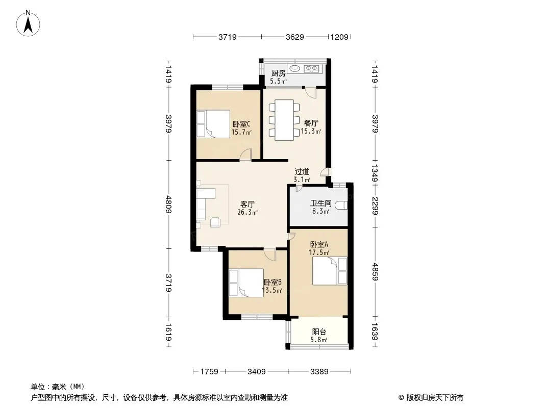 户型齐全,主打明厨,明卫,客厅朝南三居