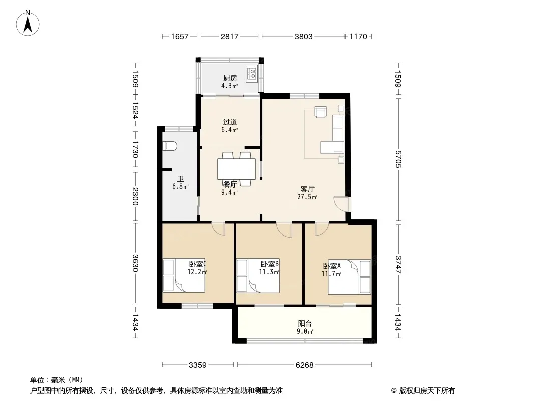 户型齐全,主打明厨,明卫,客厅朝南,主卧朝南三居