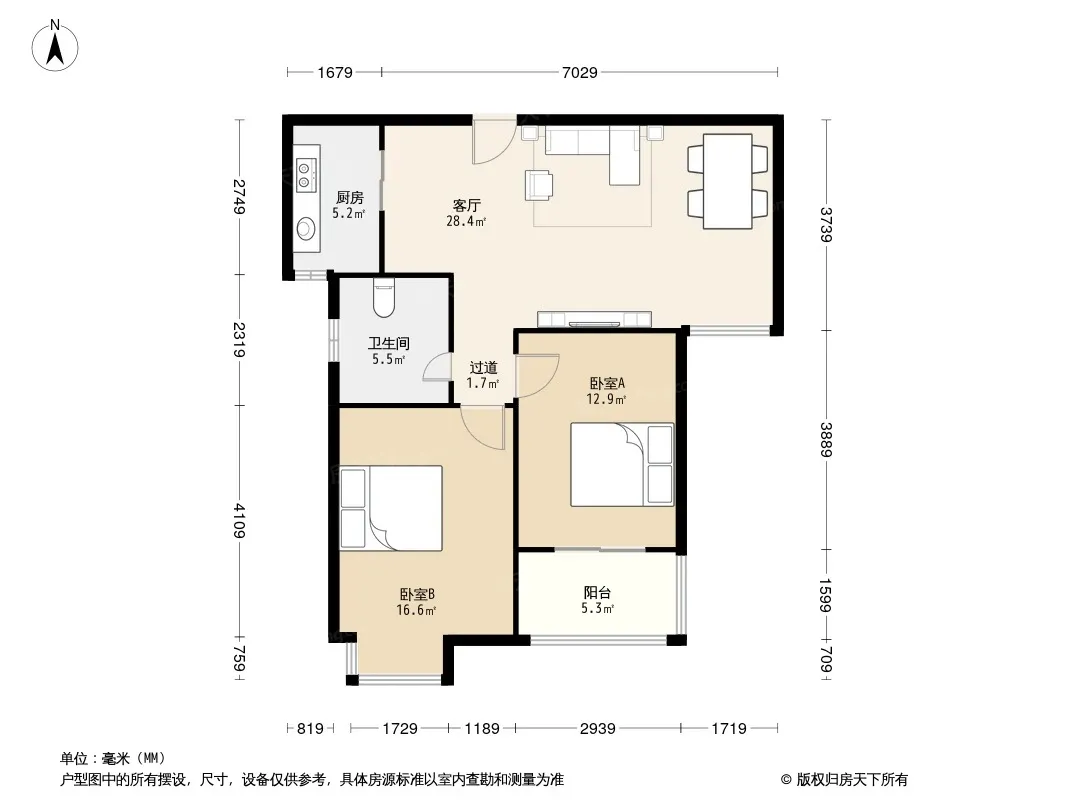 户型齐全,主打明卫,明厨,客厅朝南,主卧朝南二居