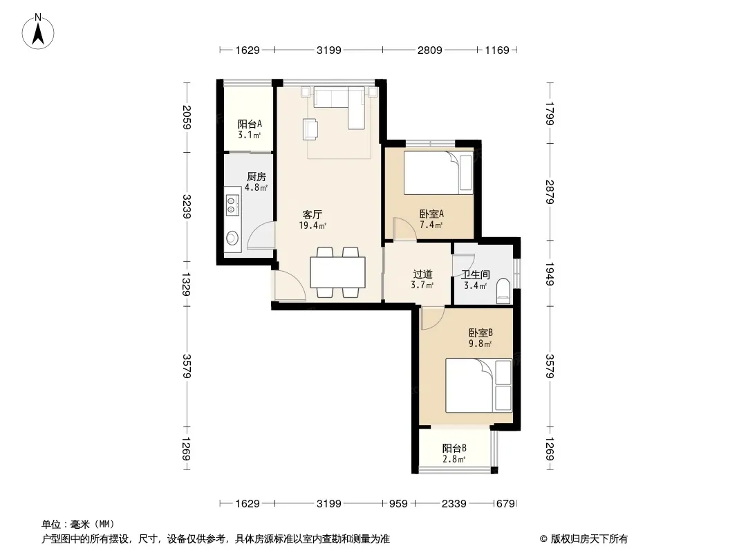 户型齐全,主打明卫,明厨,客厅朝南,主卧朝南二居