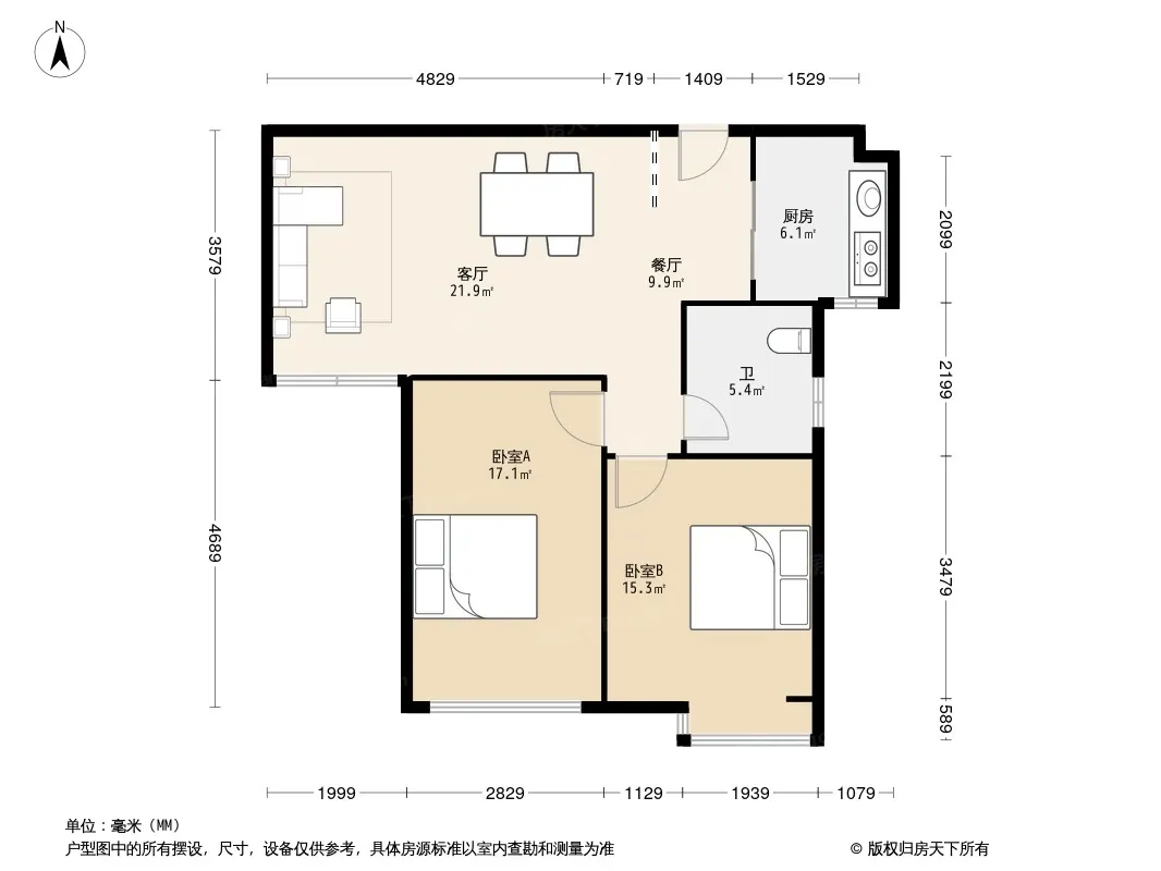 户型齐全,主打明卫,明厨,客厅朝南,主卧朝南二居