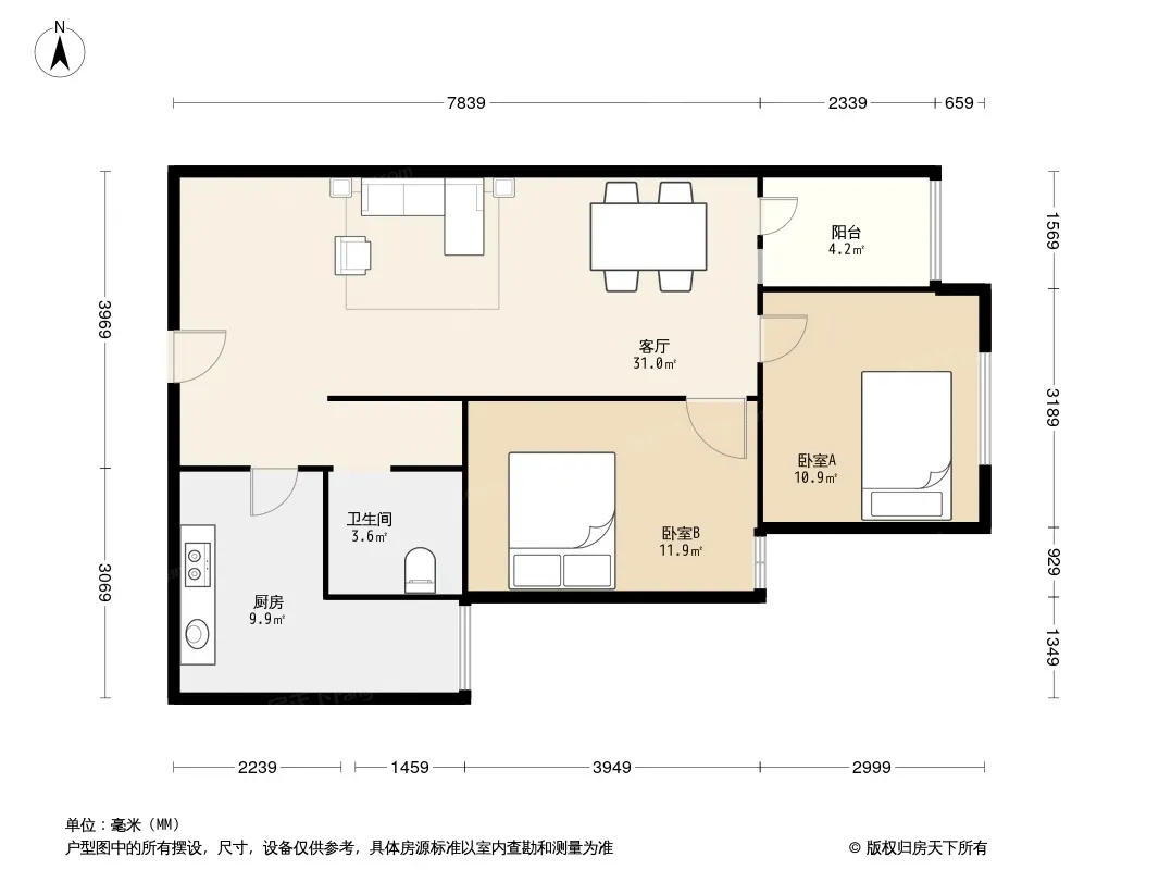 户型齐全,主打明卫,客厅朝南,双卧朝南二居