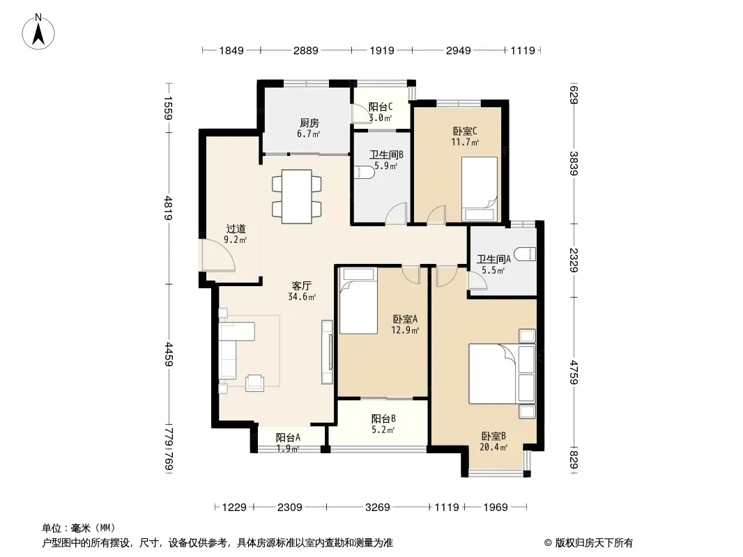 户型齐全,主打明卫,客厅朝南,双阳台,主卧朝南三居