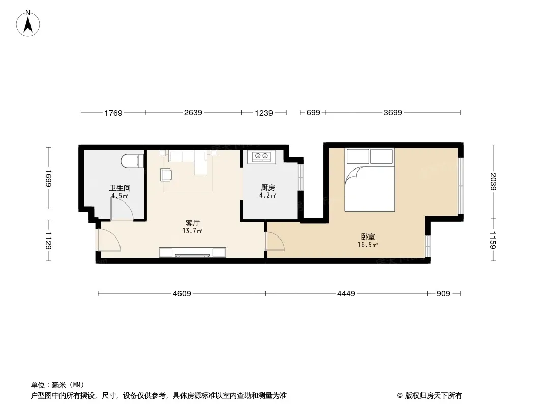 户型齐全,主打明厨,客厅朝南,主卧朝南一居