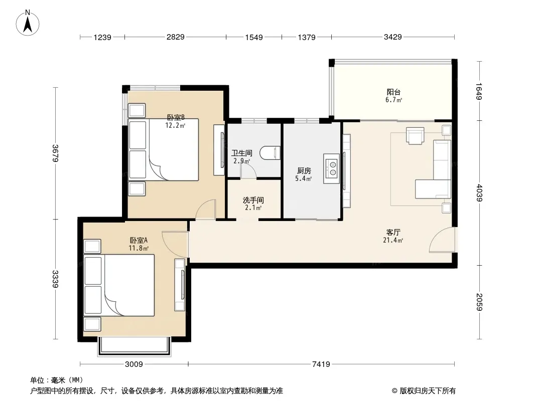 户型齐全,主打南北通透,主卧带卫,客厅朝南,主卧朝南,干湿分离二居