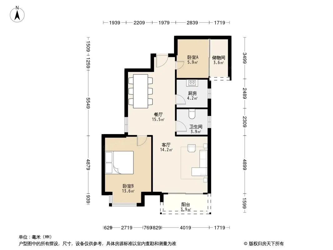户型齐全,主打南北通透,主卧带卫,客厅朝南,主卧朝南,干湿分离二居