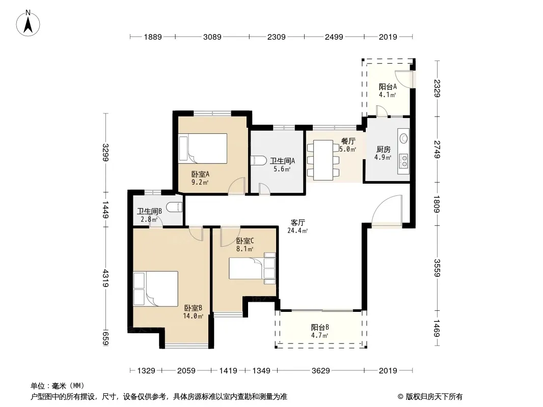户型齐全,主打南北通透,全明格局,采光充足三居