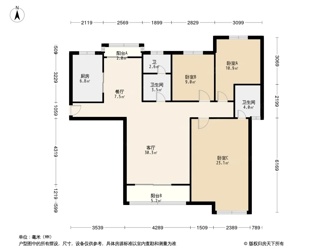户型齐全,主打南北通透,全明格局,采光充足三居