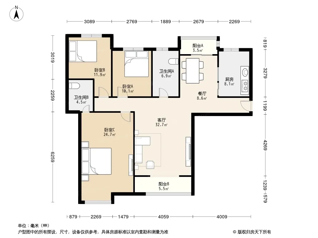 户型齐全,主打南北通透,全明格局,采光充足三居