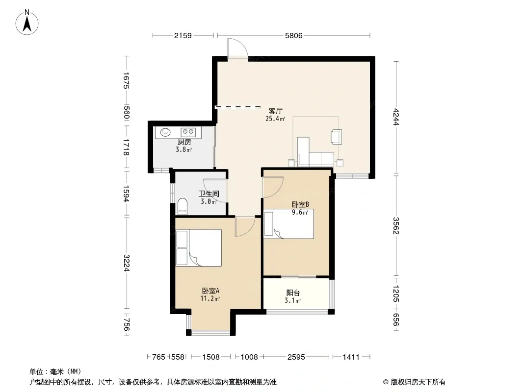 户型齐全,主打明厨,明卫,客厅朝南,主卧朝南二居
