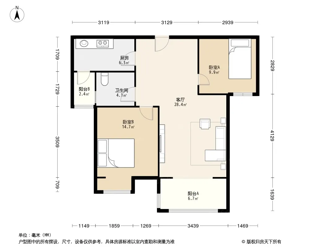 户型齐全,主打明厨,明卫,双卧朝南,主卧朝南三居