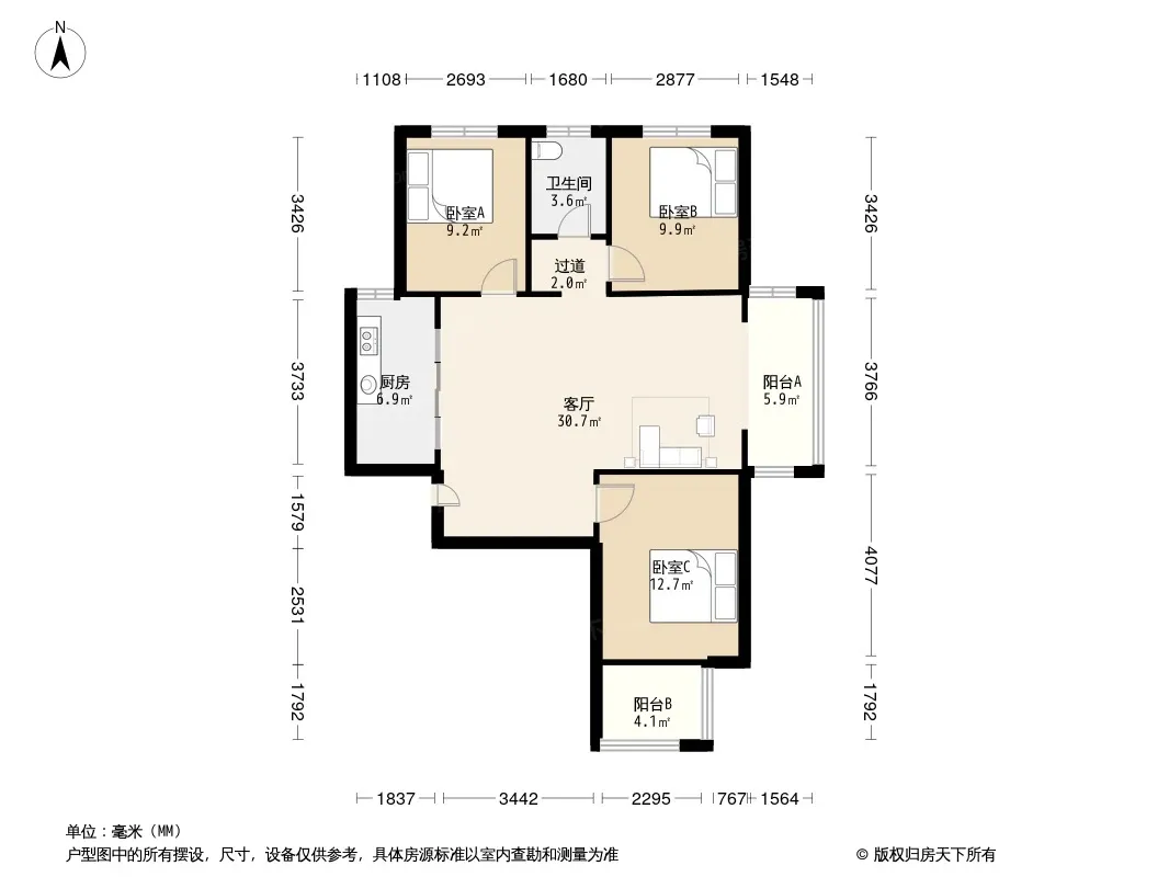 户型齐全,主打明厨,明卫,客厅朝南,主卧朝南三居