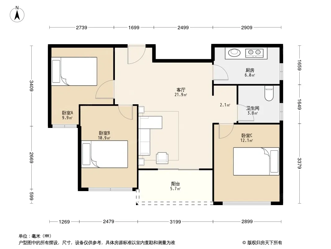 户型齐全,主打南北通透,全明格局,客厅朝南,主卧朝南,厨卫不对门,明厨明卫,干湿分离三居