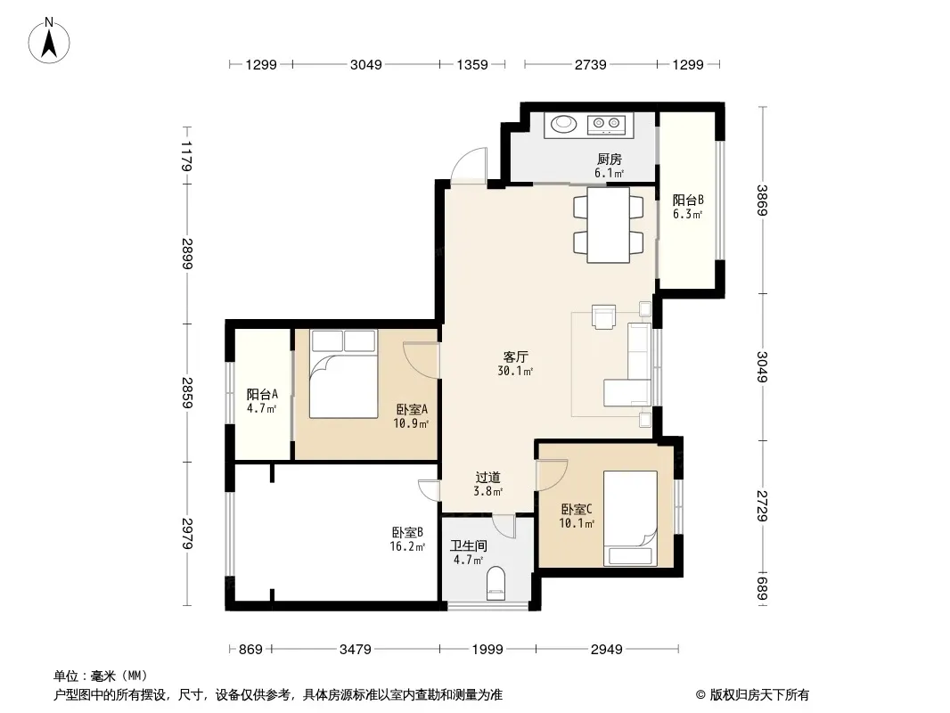 户型齐全,主打南北通透,主卧带卫,客厅朝南,主卧朝南,双阳台三居