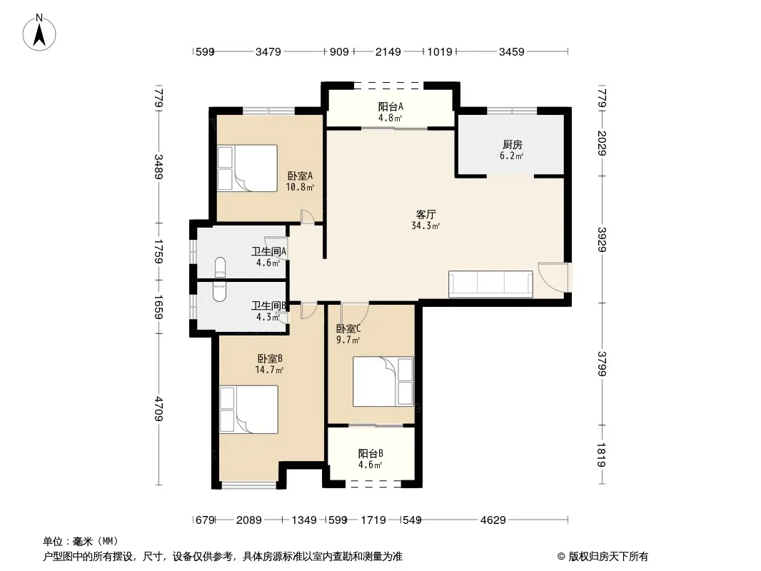 户型齐全,主打南北通透,主卧带卫,客厅朝南,主卧朝南,双阳台三居