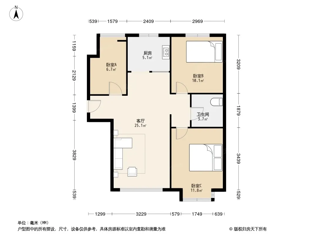 户型齐全,主打南北通透,主卧带卫,客厅朝南,主卧朝南,干湿分离三居