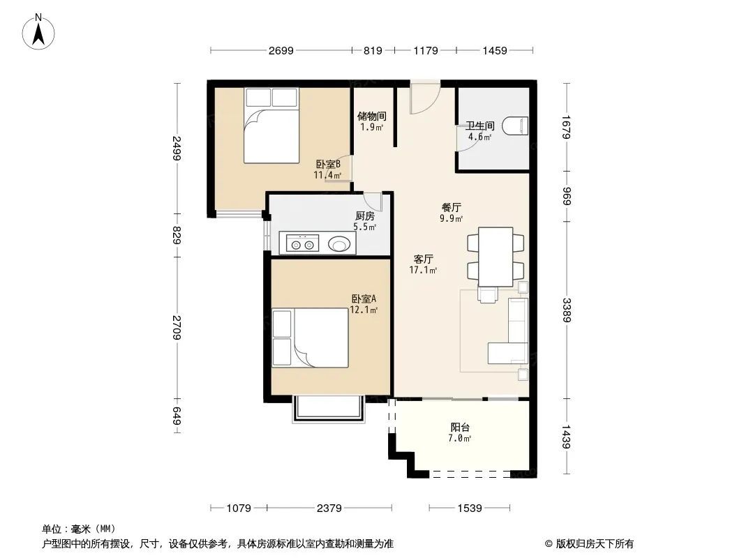 户型齐全,主打南北通透,客厅朝南,主卧朝南,观景飘窗二居