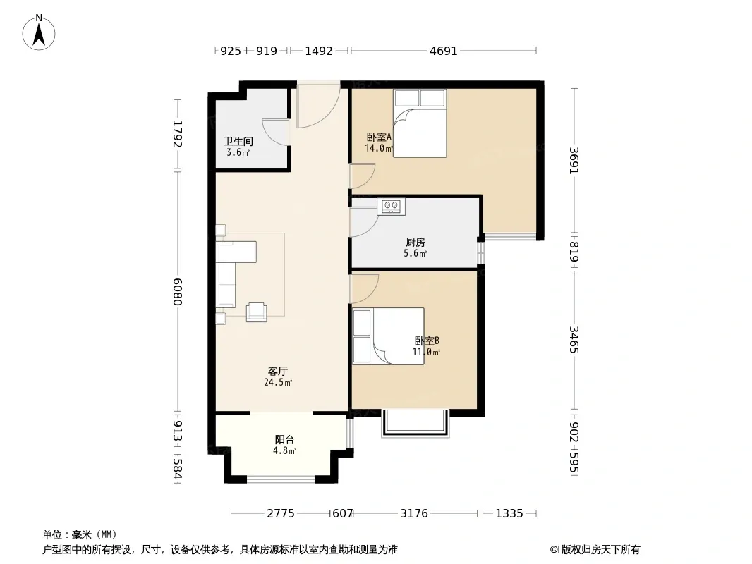 户型齐全,主打南北通透,客厅朝南,主卧朝南,观景飘窗二居