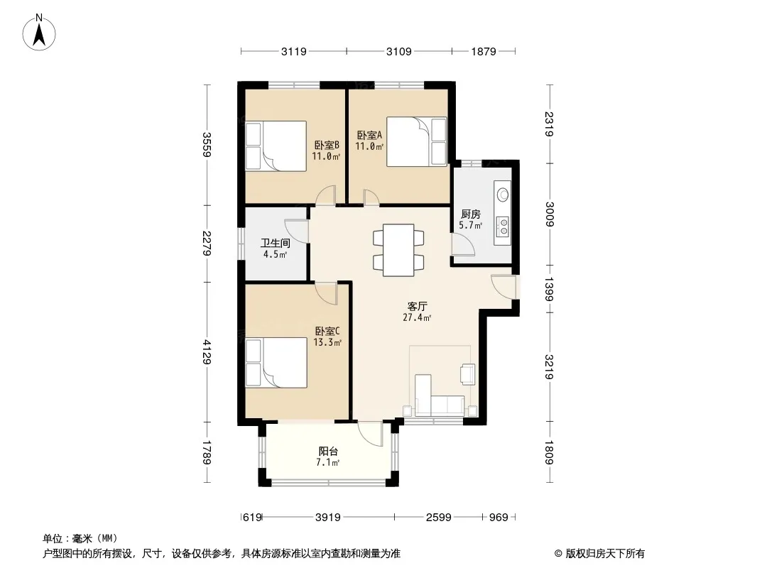 户型齐全,主打南北通透,客厅朝南,主卧朝南,全明格局,卧室带阳台三居