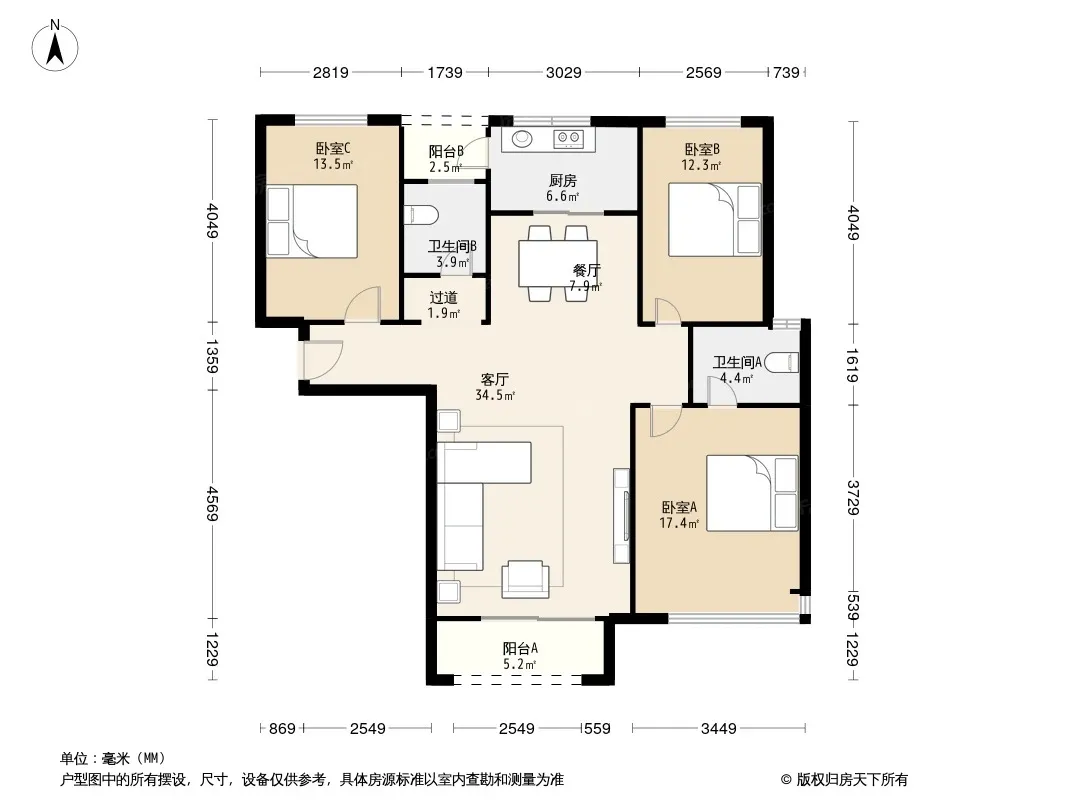 户型齐全,主打南北通透,客厅朝南,主卧朝南,观景飘窗,全明格局,双阳台三居