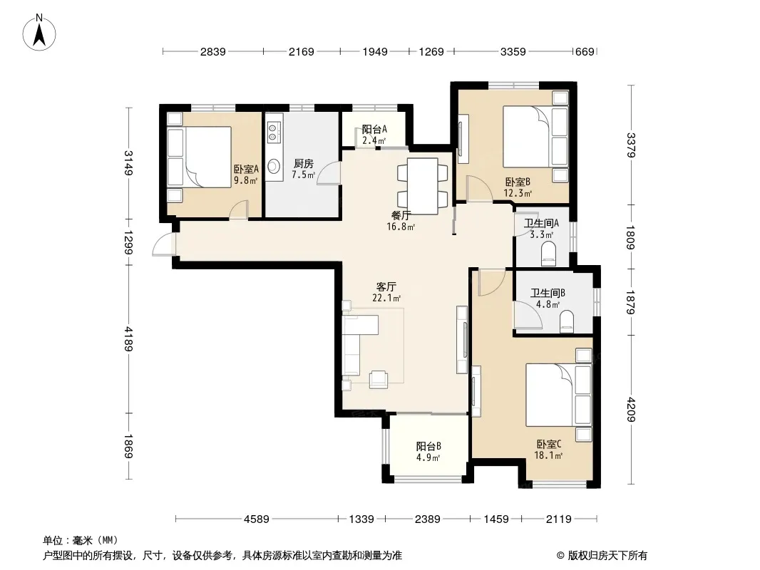 户型齐全,主打南北通透,主卧带卫,双阳台三居