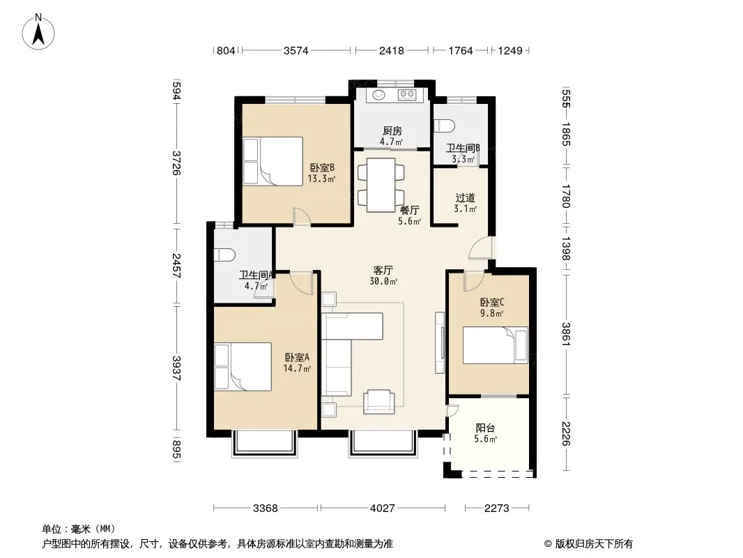 户型齐全,主打户型方正,明卫,明厨,客厅朝南,主卧朝南三居