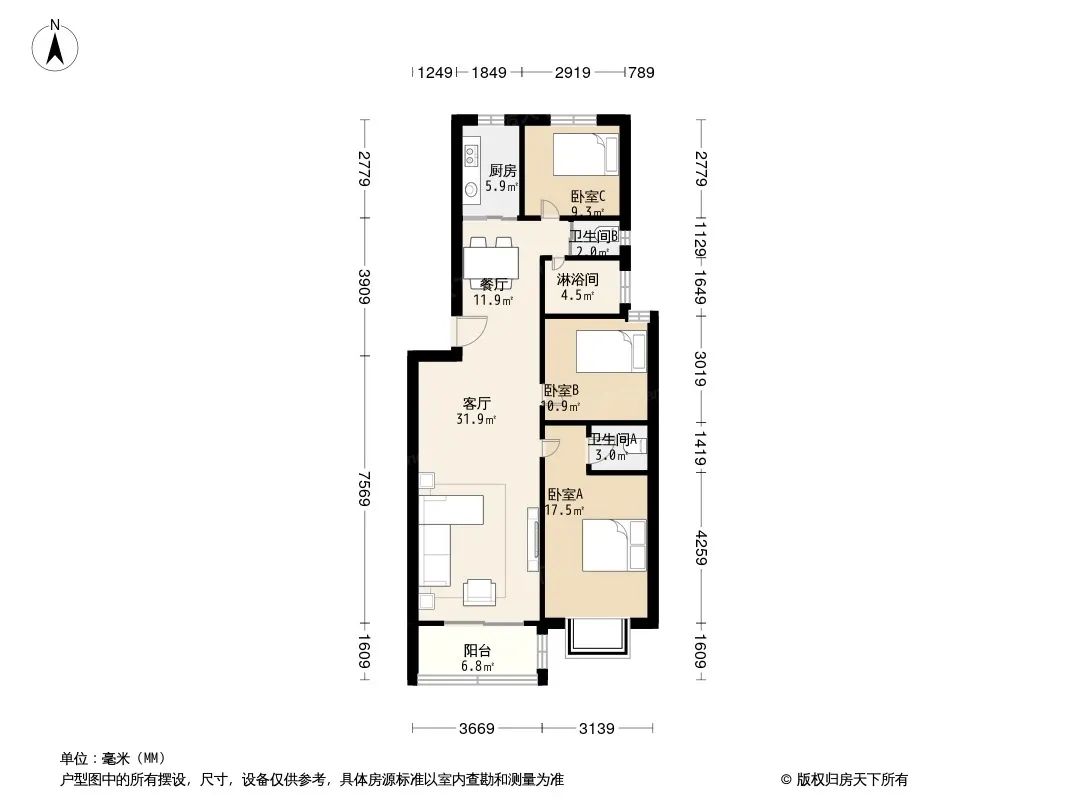户型齐全,主打明厨,客厅朝南,主卧朝南三居
