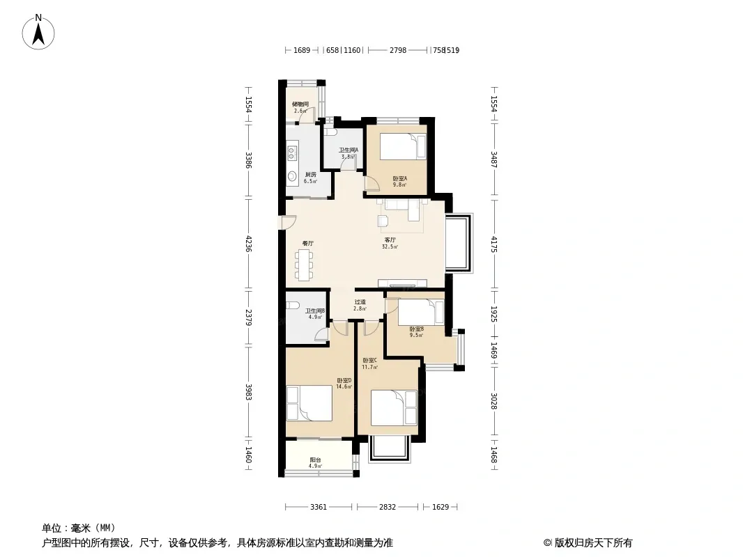 户型齐全,主打明卫,双卧朝南三居