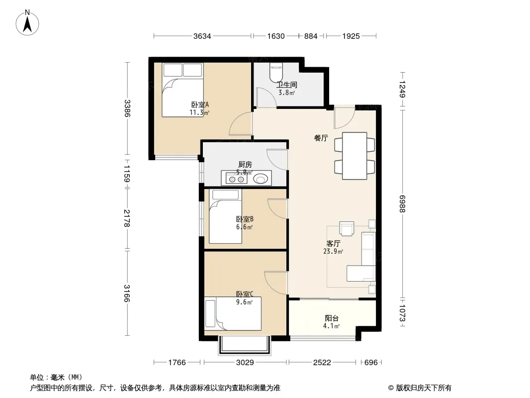 户型齐全,主打明卫,双卧朝南三居