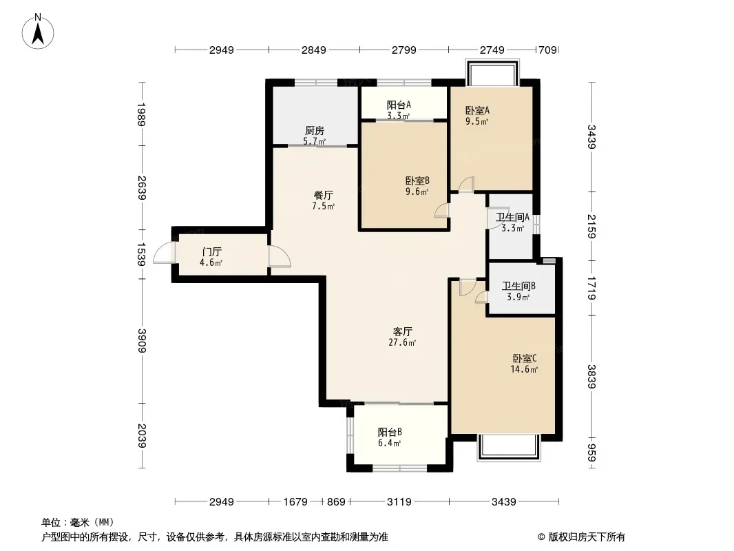 户型齐全,主打南北通透,客厅朝南,主卧朝南,观景飘窗三居