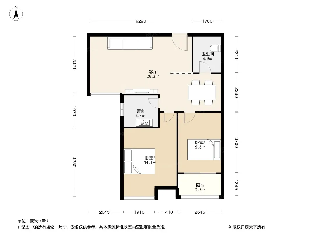户型齐全,主打户型方正,明厨,客厅朝南,主卧朝南二居