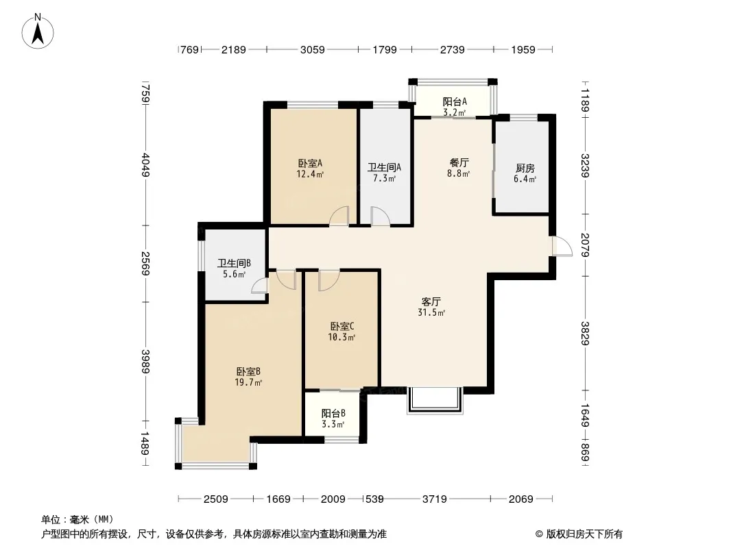 户型齐全,主打全明格局,客厅朝南,卧室朝南,主卧朝南,卧室带阳台三居
