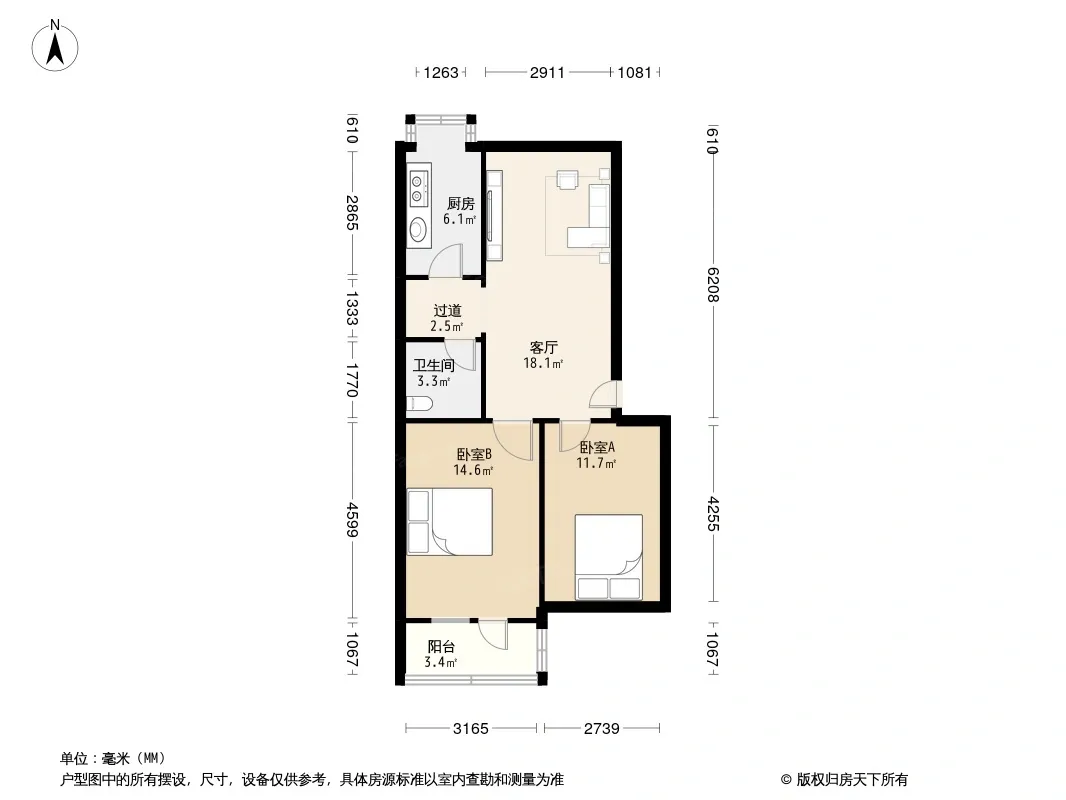 户型齐全,主打明卫,明厨,客厅朝南三居