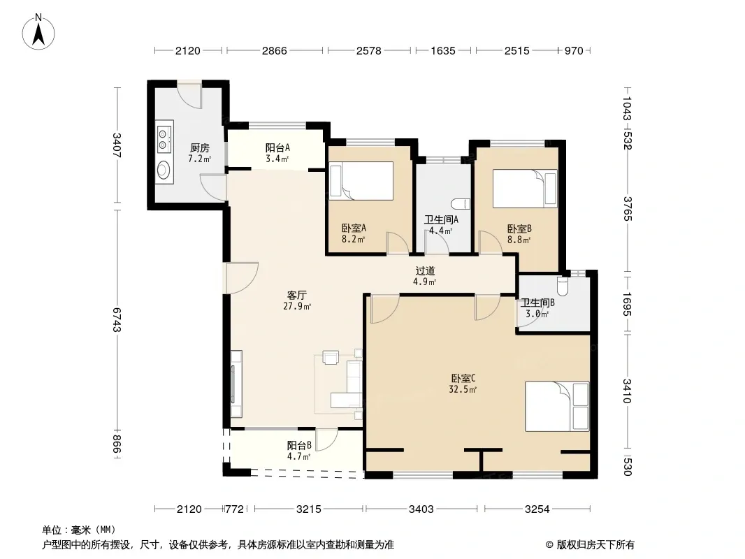 户型齐全,主打南北通透,全明格局,户型方正,采光充足三居