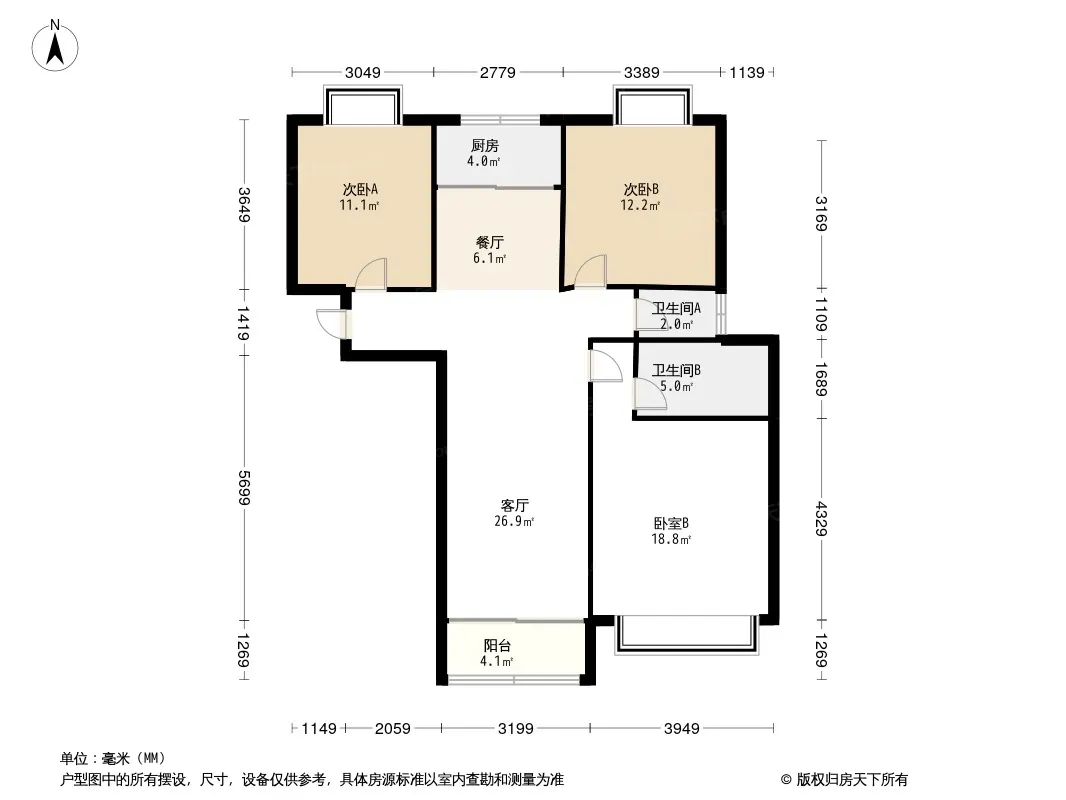 户型齐全,主打南北通透,户型方正,客厅朝南,主卧朝南,明厨明卫三居