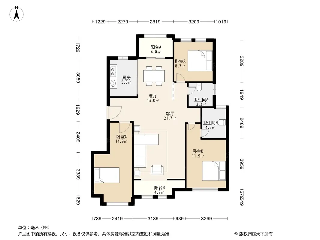 户型齐全,主打南北通透,主卧带卫,干湿分离三居