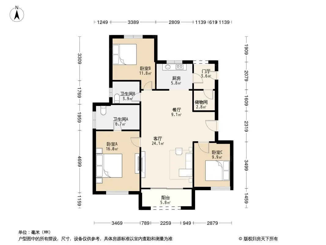 户型齐全,主打南北通透,主卧带卫,客厅朝南,主卧朝南三居