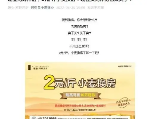 如果“一人购房全家帮”,能称得上是“奇招”,那还有更“奇”的。6月20日,民权县中原建业公众号发布《建业河畔洋房,2元/斤小麦换房!现在买纯洋房也太爽了!》一文,表示民权建业河畔洋房推出小麦换房活动,小麦可以2元/斤抵首付,最高可抵16万房款。
