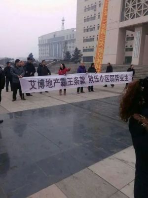 2015年伊始,呼和浩特市艾博龙园的业主就把维权的条幅拉到了回民区 的大门口。艾博龙园A区的业主曹女士向记者细数了开发商的“十宗罪”:五证不全、延期违约交房不给赔偿金、交房时强制业主补交20%的房款、小区内规划与售楼图纸完全不符、私自去掉绿化进行加盖、配套费已全部交清却6年不通天然气….因手续不全,开发商无法办理按揭,不得不向业主进行催款,这件事情也成了此次业主维权的导火索。艾博龙园的开发商艾博云房地产开发有限公司多次找派社会人员晚上到业主家中进行骚扰、恐吓、私自给业主断电等一系列违法行为进行催款,并且以不交钱就不给钥匙为由进行威胁,终激起了业主的大爆发。