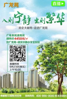 舒适的居住环境,4字头的准现房,没有人能不为之所动!本期房天下直播将会实地探访广龙苑,邀请营销总监深度解读项目,有关开发商、地理位置优势、自身配套……一切信息将会在直播中释放,足不出户,看4字头准现房,9月23日10点30不见不散!