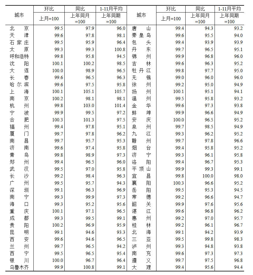国家统计局公布的11月70个大中城市新建、二手商品住宅价格情况显示,70个大中城市新建商品住宅中,11个城市房价上涨,59个城市房价下跌;二手房方面,70个城市房价下跌。
