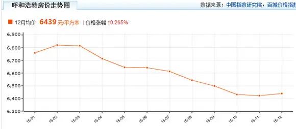 根据房天下中指研究院数据统计,呼和浩特12月均价为6439元/平方米,奇怪的是呼和浩特房价较11月还真是涨了0.265%,终止了2015年1月以来的下跌势头。也许是年终各大开发商钜惠促销活动做得猛,激起房价上涨,也许是受"去库存"基调影响,扩张需求。