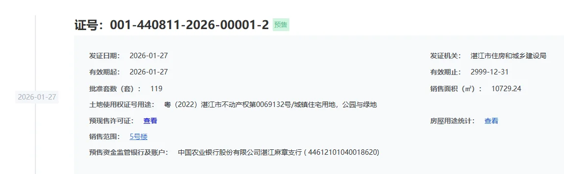 嘉富·朗铂湾豪庭7号楼获得商品房预售许可证 预售100套住宅