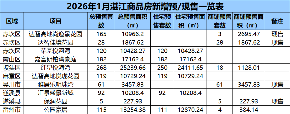 1月湛江10个项目获预/现售证 总供应套数1155套