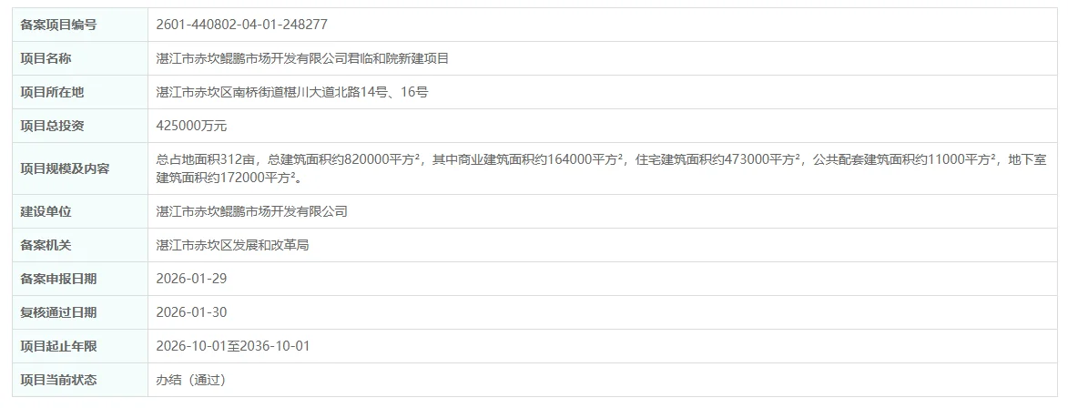 总投资42.5亿!湛江赤坎区新盘——君临和院备案公示