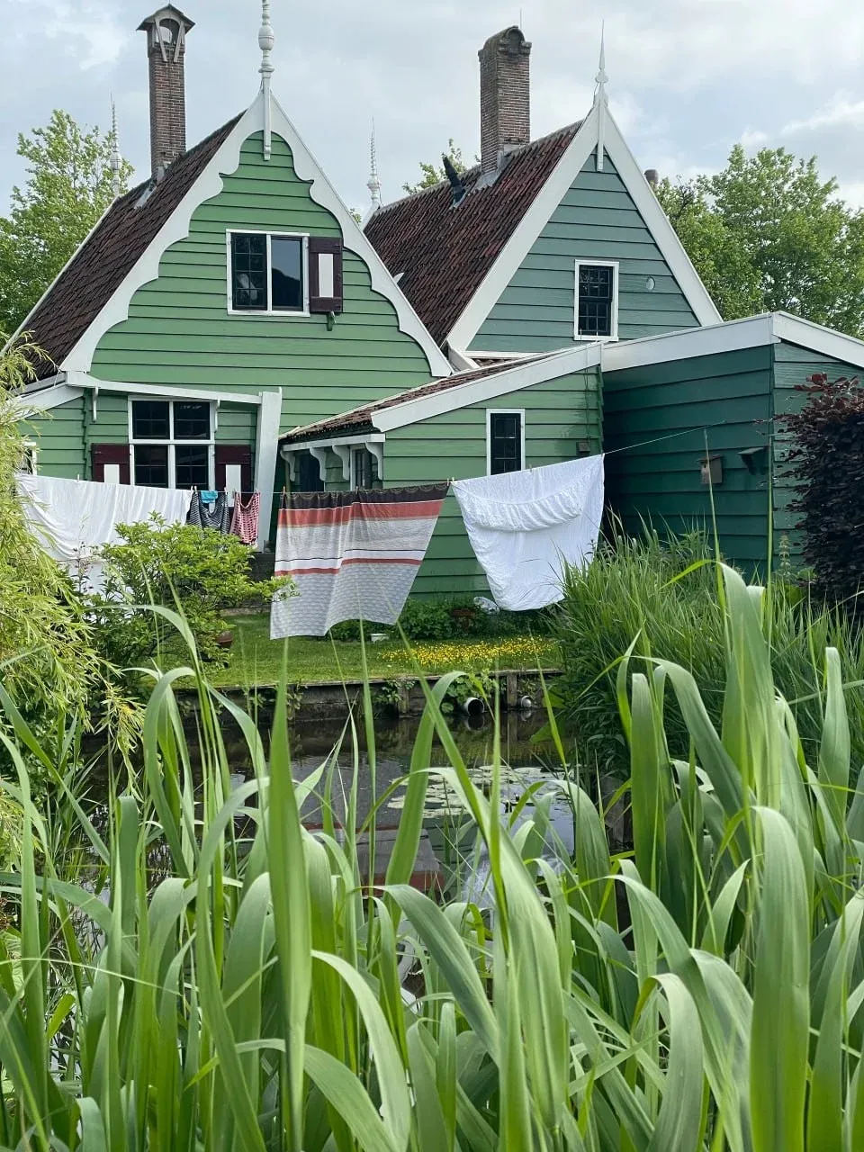 荷兰乡村的房屋,是典型的荷兰风格,陡峭的屋顶、精美的木制外墙,与周围的环境和谐共生。绿色的外墙与红色的屋顶形成鲜明对比,为乡村增添了一抹亮色。房屋前,晾衣绳上挂着五彩斑斓的衣物,随风轻轻摇曳,透露出一种简单而温馨的生活气息。周围的绿色植物和高高的芦苇,仿佛为房屋披上了一层绿色的外衣,让人感受到大自然的生机与活力。